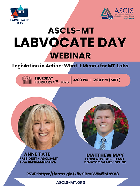 ASCLS-MT President & ASCLS PAC Representative → A clear, accessible update on national and state advocacy priorities, bill tracking, and how ASCLS is working to protect the laboratory workforce and the future of our profession.